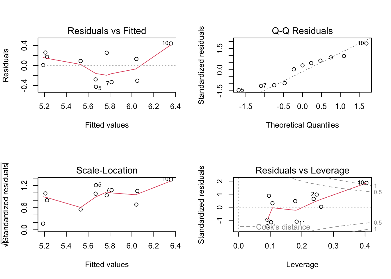 Residuals seem homoscedastic (consistent across values) based on Residuals vs. Fitted and Scale-Location plots. Residuals seem normally distributed based on the QQ plot, the points mostly follow the reference line. There were also no outliers that might influence model estimates or predictions based on Residuals vs. Leverage.